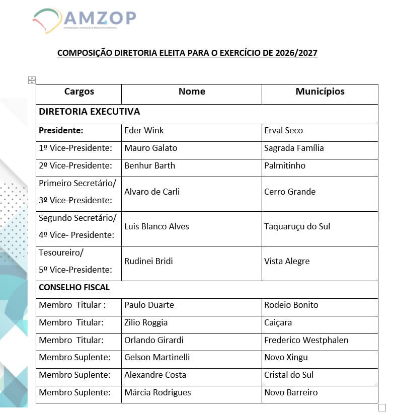 Éder assume o cargo na vaga do prefeito de Seberi, Adilson Balestrin. A nova diretoria eleita assume com a responsabilidade de gerir as ações da entidade pelos próximos dois anos, no biênio 2026-2027, mantendo o foco na integração regional e na defesa de pautas prioritárias junto aos governos estadual e federal.