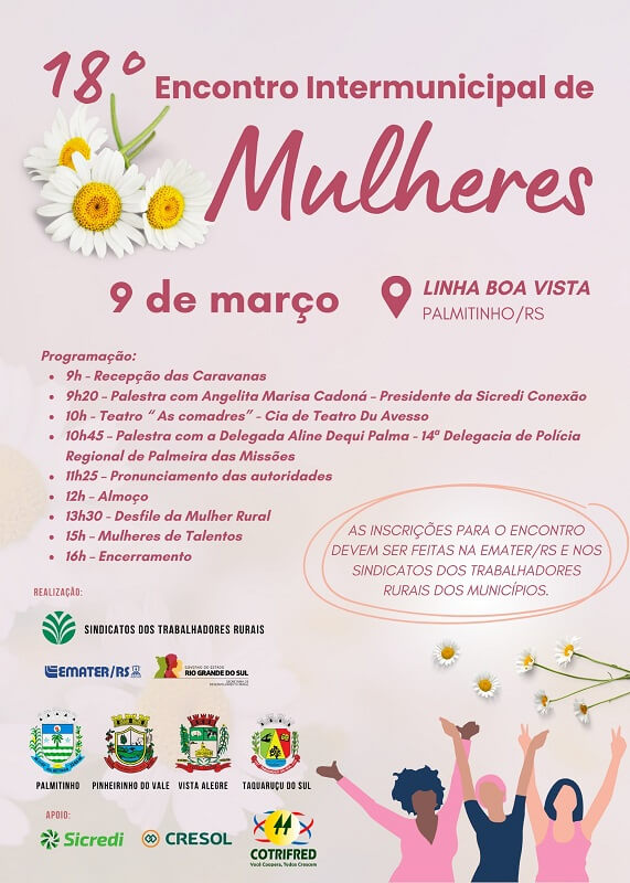 O 18º Encontro Intermunicipal de Mulheres é uma realização da Emater-Ascar/RS, Administração Municipal de Palmitinho e Sindicatos dos Trabalhadores Rurais (STR) dos municípios participantes.