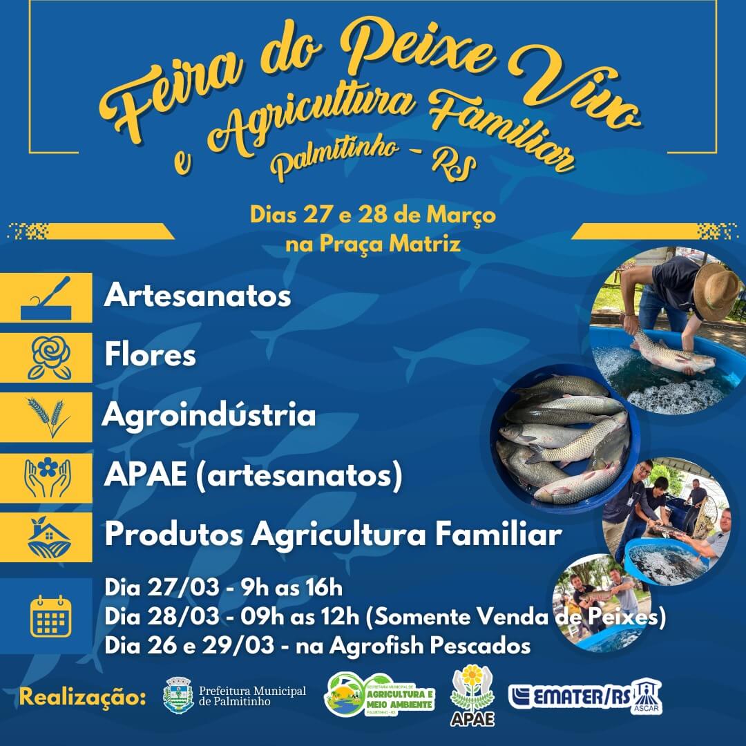 Já tradicional no município, a Feira do Peixe Vivo e da Agricultura Familiar ocorre na próxima semana, na Praça da Matriz de Palmitinho.