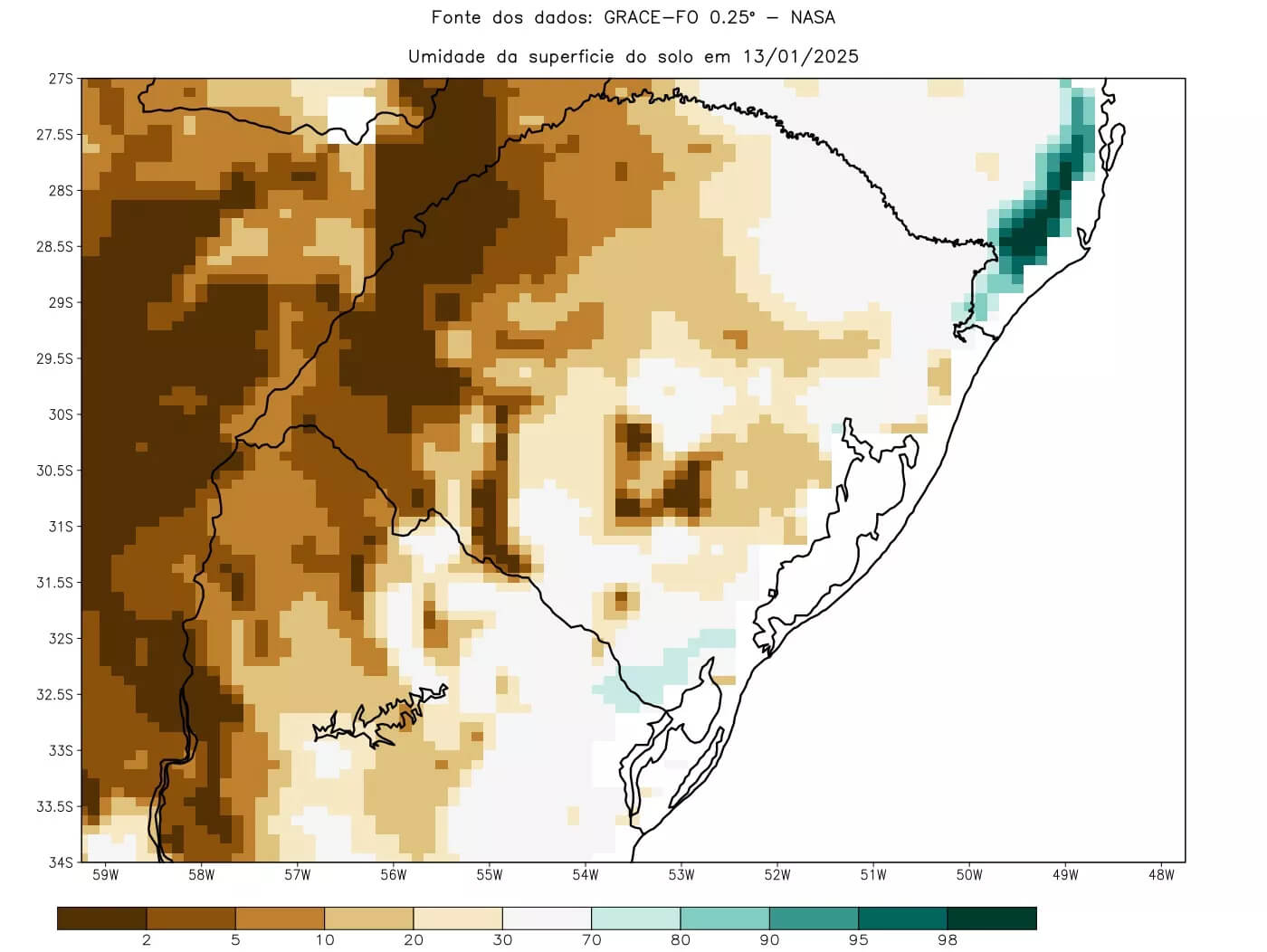 Apesar do ano de 2024 ter sido muito chuvoso, garantindo boas reservas hídricas, a falta de precipitações regulares e as altas temperaturas das últimas semanas têm reduzido rapidamente a umidade do solo em várias áreas do Estado. Dados do sistema GRACE da NASA mostram um déficit significativo de umidade superficial no solo, especialmente nas regiões Oeste e Noroeste do Rio Grande do Sul.